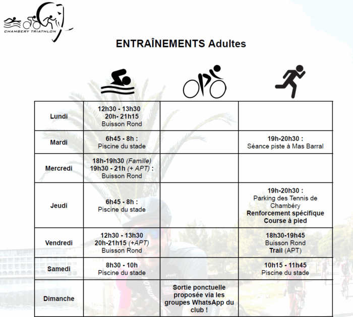 Les entraînements natation ont lieu à la piscine de Buisson Rond : Rue Sainte-Rose, 73000 Chambéry